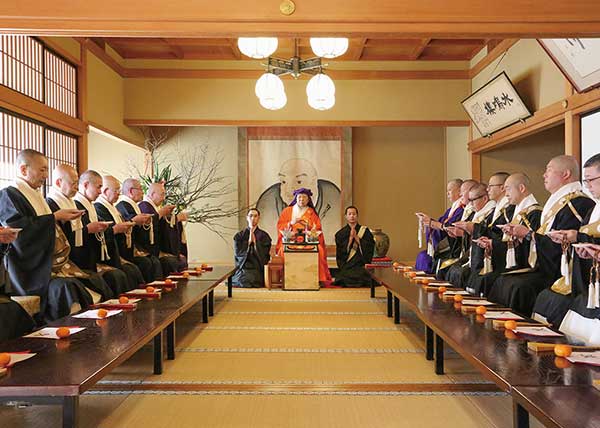 午前10時より本堂に於いて、持田日勇法主猊下大導師のもと、望月一老職、浜島総務、身延山支院各聖が副導師として列座して、御年頭会が執り行われた。