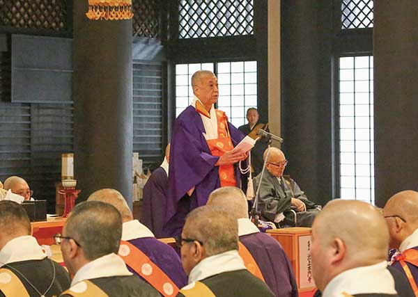 法味を言上した後、浜島総務より新住職担任一人ひとりに認証書が親授された。その後、代表者より、署名簿の奉奠と宣誓が述べられ、行学二道の精神で、信徒の教化育成に努力することを誓った。続いて、浜島総務より記念品が贈呈された。