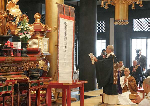 式衆退堂後、本堂に掲げられる『微妙法』扁額除幕式が執り行われた。