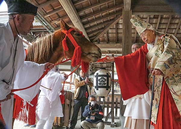 法要後には、日蓮聖人が馬に乗られて波木井公の館に向かわれたことに倣って、曳馬式が執り行われた。院内修法師の加持祈祷を受けた2頭の駿馬が、多くの参拝者が集まった境内を闊歩した。