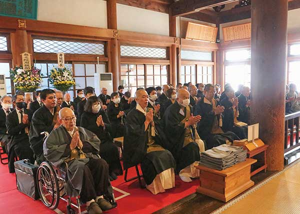 式終了後、新住職担任は御真骨堂を拝して、浜島総務を囲み記念撮影を行った。
