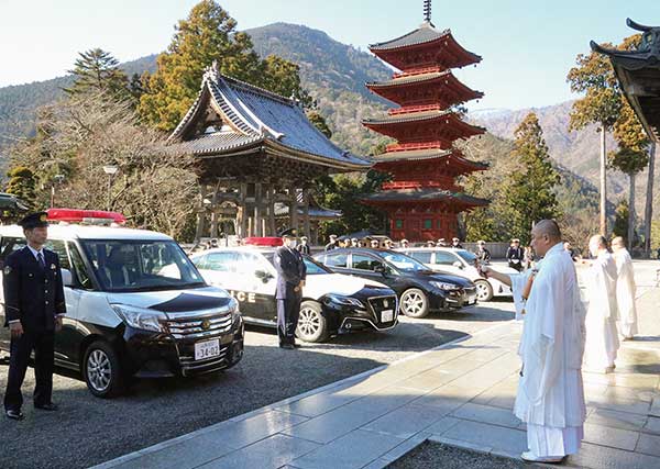 午前10時より、境内に停められた警察車両に対して法楽加持を修した後、棲神閣祖師堂に於いて、池上庶務部長導師のもと、院内修法師が出仕して、南部警察署管内交通安全祈願が執り行われた。