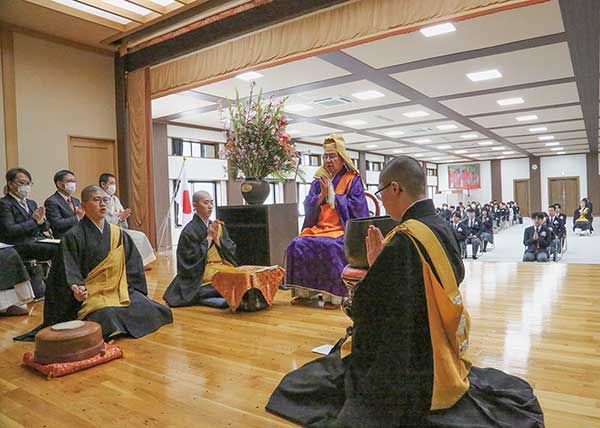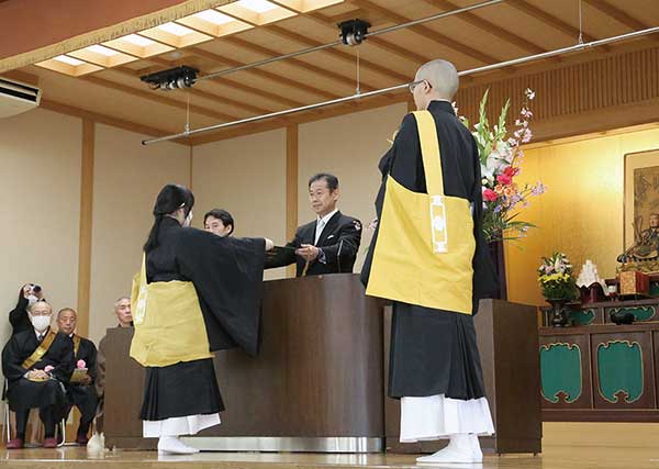 まず、退院生の点呼が行われた後、持田法主猊下より「祖山伝燈師」の辞令の伝達と階章が退院生に授与され、訓諭を賜った。続いて、退院生への記念品が贈呈された。